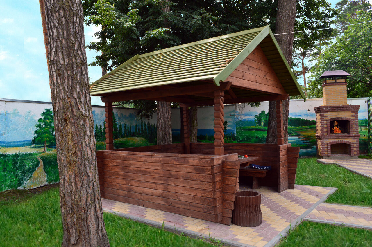 Вкусная еда. Зеленая территория, есть место для того, чтобы полежать на солнышке близ сосен. Разнообразно питание.