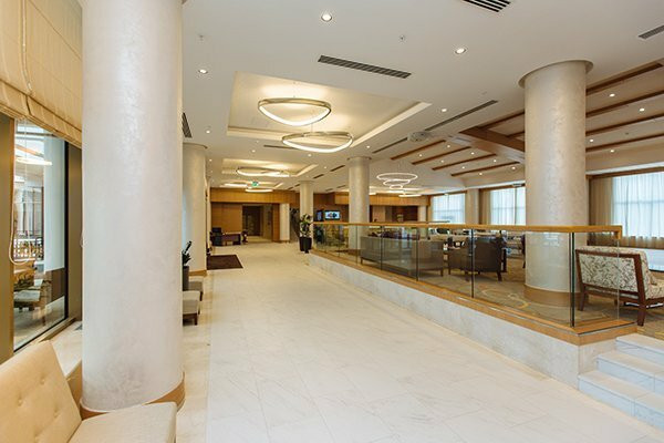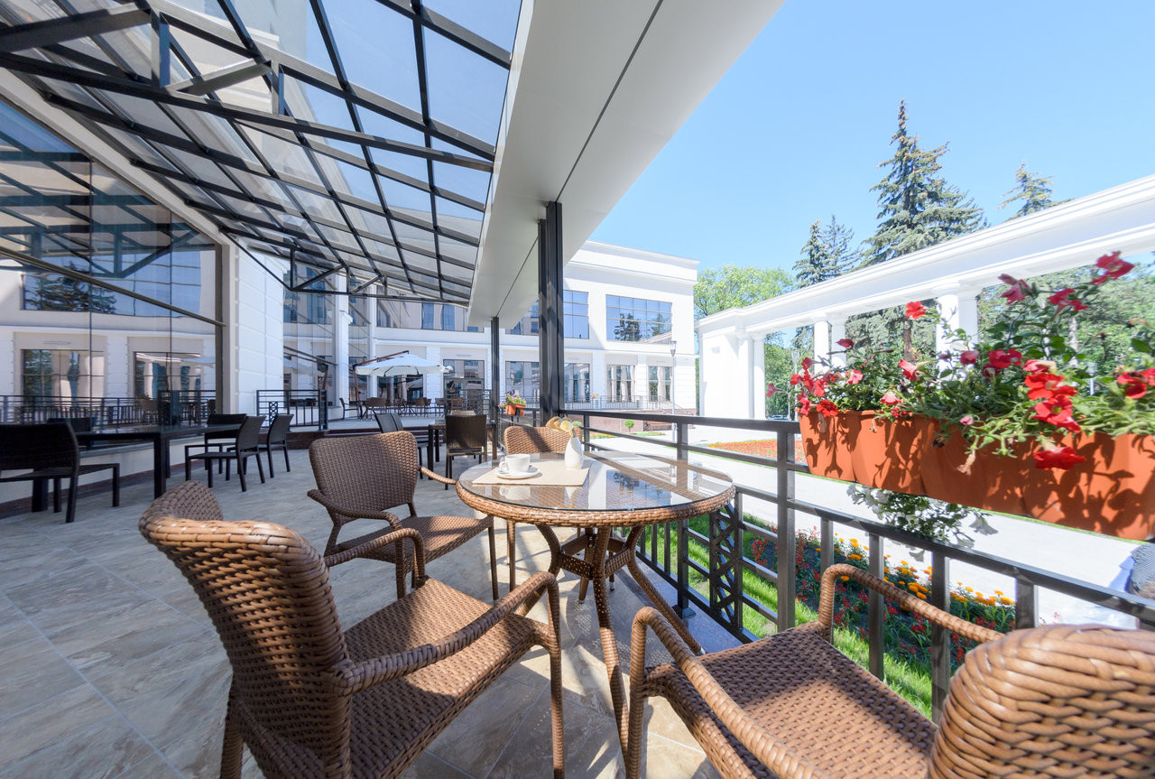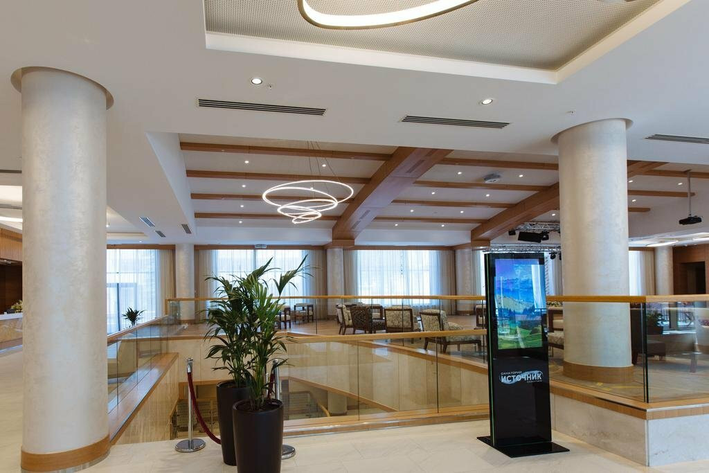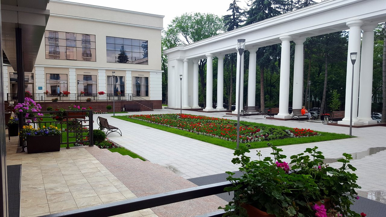 Новый красивый санаторий в г.Ессентуки. Интересный лобби-бар с ветражными окнами. В самом центре курортной зоны, рядом с новым шикарным входом в целебный парк с фантанами и лавочками. На такси от жд до санатория 4 минуты. Современный санаторий.
