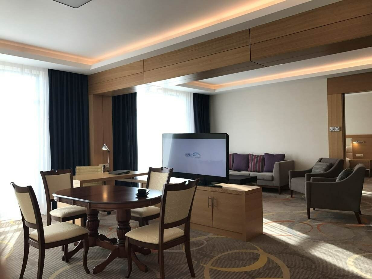 Отдыхали в данном санатории на новогодних каникулах. Расположение отличное, самый центр города, санаторий новый, номера большие и комфортные. Питание - шведский стол - неплохое, голодными точно не останетесь. Лечебная база тоже хорошая, но вот врачи вызывают сомнения.. особенно педиатр. Нам просто не повезло, через неделю пребывания там заболел ребенок 9 лет. Поднялась высокая температура и кашель, так вот врач даже не дошел до ребенка, начал назначать лечение на расстоянии.. и только после небольшой "разборки" у главного врача - соизволил прийти и осмотреть, и послушать, и даже в горло заглянуть)) Если бы ни этот случай, то отдых и лечение прошли бы просто отлично!! В целом санаторий можно рекомендовать для отдыха.