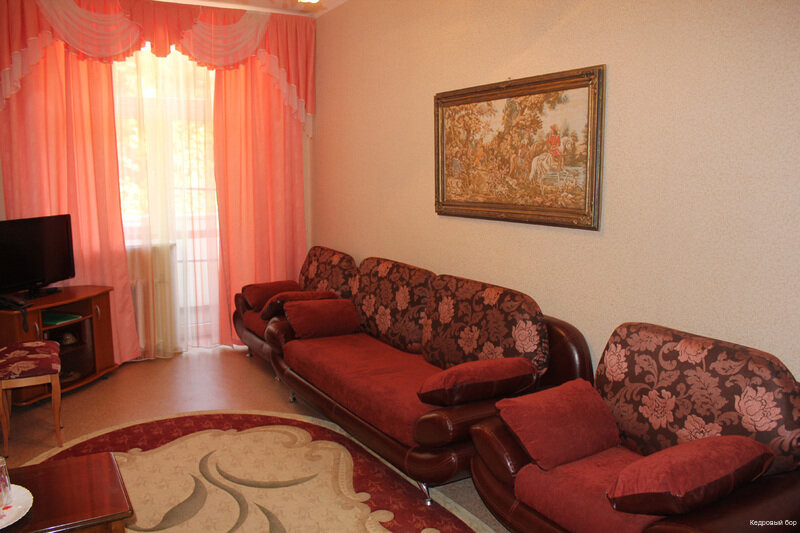 Просто решили в пятницу отдохнуть за городом, нашла Кедровый бор, позвонила и забронировала на сутки(сб-вс). Администратор замечательная - быстро оформила заезд, сотрудники даже помогли нам решить проблему с тяжелыми сумками с парковки до 3 корпуса (самый дальний).Спасибо им большое!:) Территория огромная и красивая - много дорожек. Отдыхали с ребенком 9 лет в номере Люкс(стоимость номера+ доплата за ребенка без питания и доп.услуг). Большой, чистый, красивый просторный номер со свежим ремонтом и даже неожиданно обрадовало то, что в номере была микроволновая печь,холодильник, и кухонный гарнитур со всеми принадлежностями и даже раковина - самое то для отдыха с детьми-малоешками, т.к. питание в санатории не всем детям подойдет. Питание было в кафе-баре (3 р/д) - очень вкусно и сытно, быстрое обслуживание - девушка-официант большая молодец и повара конечно же:) Номер был в самом дальнем корпусе - тишина и уют, хоть и далеко от парковки и бассейна, но ведь оно и хорошо! От горки ребенок был просто в восторге! Организован прокат разнообразного инвентаря. Также в путевку у нас вошло бесплатно на 2-х взрослых: 1час бассейна (за ребенка доплата 140 р/ч), 20 мин кедропластовой кабины, 2 кислородных коктейля. Персонал отзывчивый и дружелюбный и никаких поддельных улыбок, как в городе - реально отдыхаешь! Очень понравилось присутствие охраны - чувствуешь себя в безопасности. В общем, если вам нужен комфортный, спокойный, тихий, семейный отдых на природе и вы умеете соблюдать правила - то Вам сюда, а если потусить и побухать - то проедьте подальше - в 3-х км до "Томской писаницы" есть одно место без охраны и никаких правил:)
