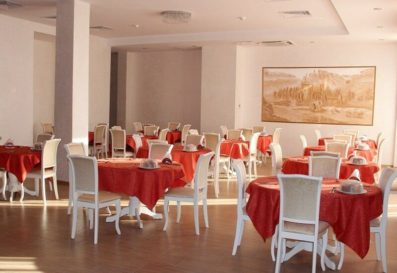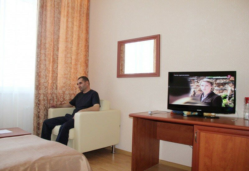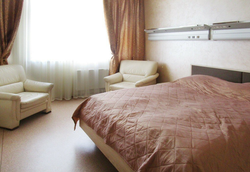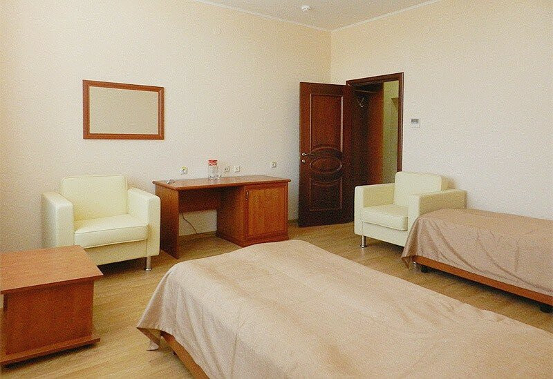 В четырехэтажном здании санатория размещен номерной фонд, включающий в себя номера категории «стандарт» и «люкс». В каждом номере есть комфортный мебельный гарнитур, холодильник, система кондиционирования, телевизор, санузел с душевой кабиной, набором полотенец, феном, туалетными принадлежностями. При необходимости в комнатах можно разложить диван или раскладушку для организации дополнительного места для сна. Питание осуществляется четыре раза в день по системе заказного меню.