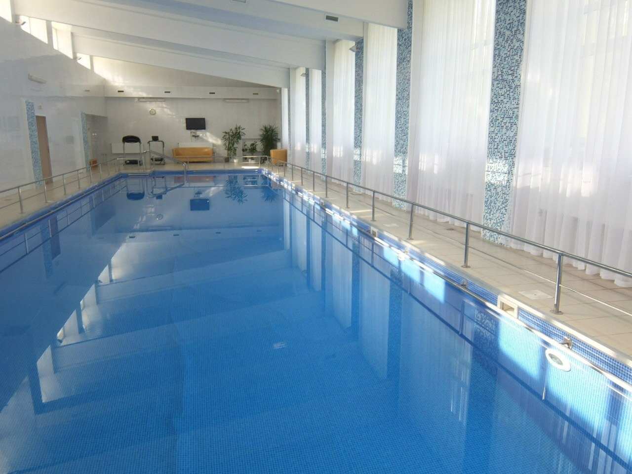 Отдыхали всей семьёй в конце августа на выходных.Нам всем очень понравилось.Номер отличный!мы брали люкс, двухкомнатный, в каждой комнате телевизор, кондиционер, есть даже гарнитур кухни и мойка, что порадовало)классная двухспальная кровать с очень классными мягкими подушками!еда вкусная,порции большие, предзаказ на следующий день.Из процедур я сходила на массаж спины, очень понравилось,массажист Дмитрий,дал рекомендации.Бассейн один, в отдельном корпусе, час бесплатно отдыхающим, запись предварительная, деткам надо только со взрослыми, потому что он достаточно глубокий.Везде очень чистенько и аккуратненько.