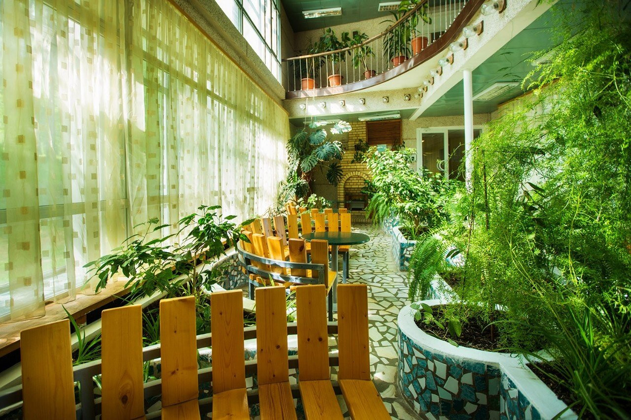 Здание санатория «Белые ключи» в Карелии состоит из двух четырехэтажных корпусов, соединенных между собой теплыми переходами. В одном из переходов расположен красивый зимний сад.