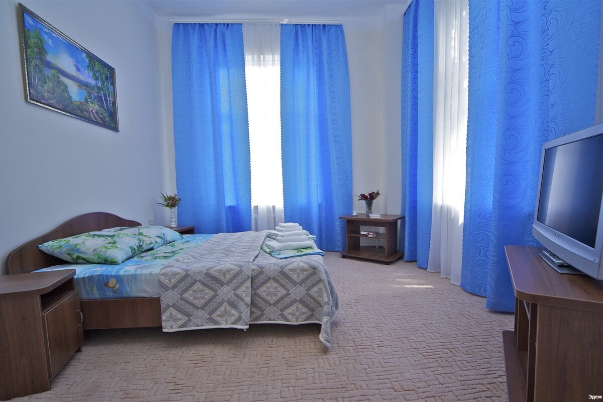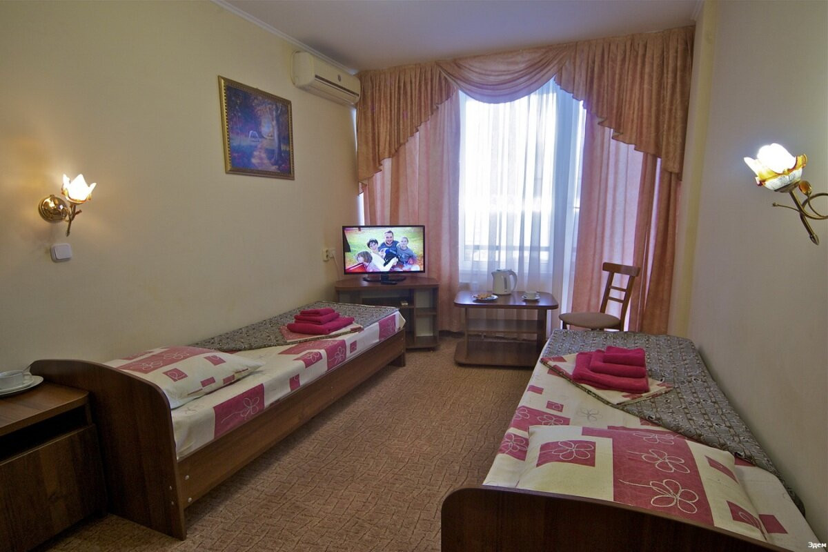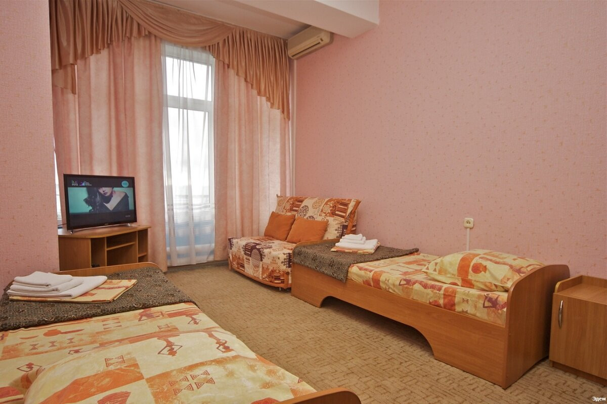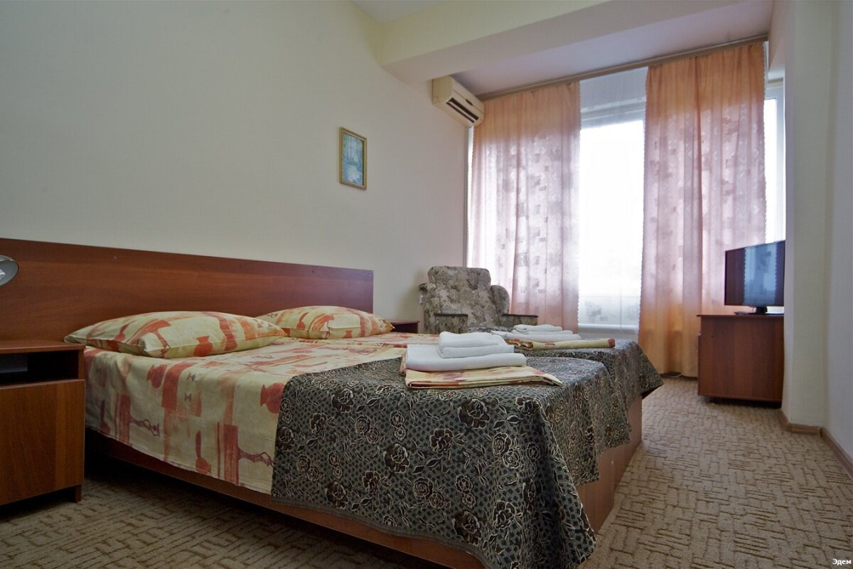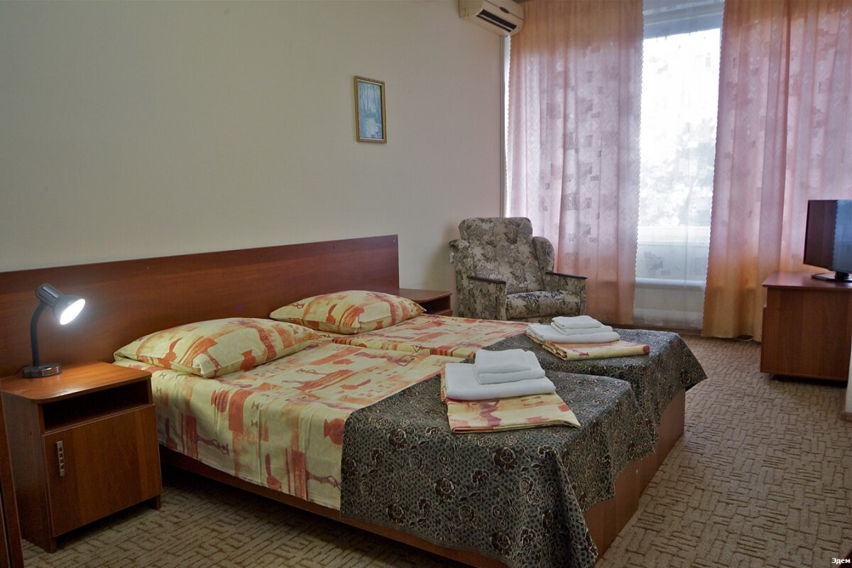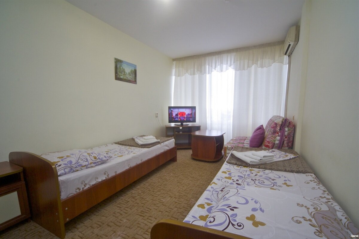 Пансионат «Эдем» построен в сорока метрах от моря, практически на пляжной полосе и располагает трехэтажным спальным корпусом на 270 мест. Находясь в номере Вы не только сможете насладиться прекрасным видом на море, но и услышать шум прибоя. Пансионат предназначен для семейного отдыха.