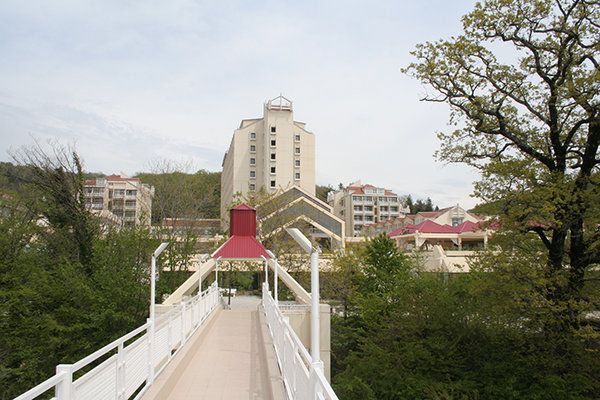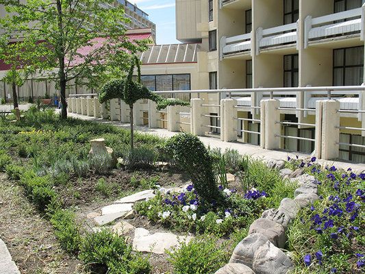Первое, что вы увидите, приехав в «Янтарь», – зеленый массив между морем и горными склонами. На территории санатория растут восемь десятков видов кустарников и больше пяти тысяч деревьев. В этой зелени 20 лет назад появились 33 здания санатория, реконструированного в 2003 году. Четыре спальных корпуса имеют медицинское назначение – отдых здесь сопровождается оздоровлением. Самые высокие корпуса (их два) – шестиэтажные, с лифтом. Санаторий рассчитан на 240 отдыхающих.
