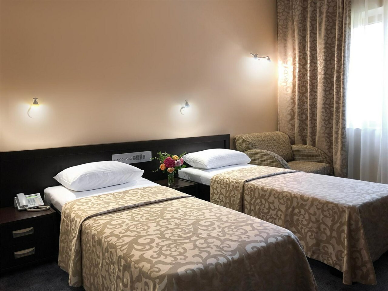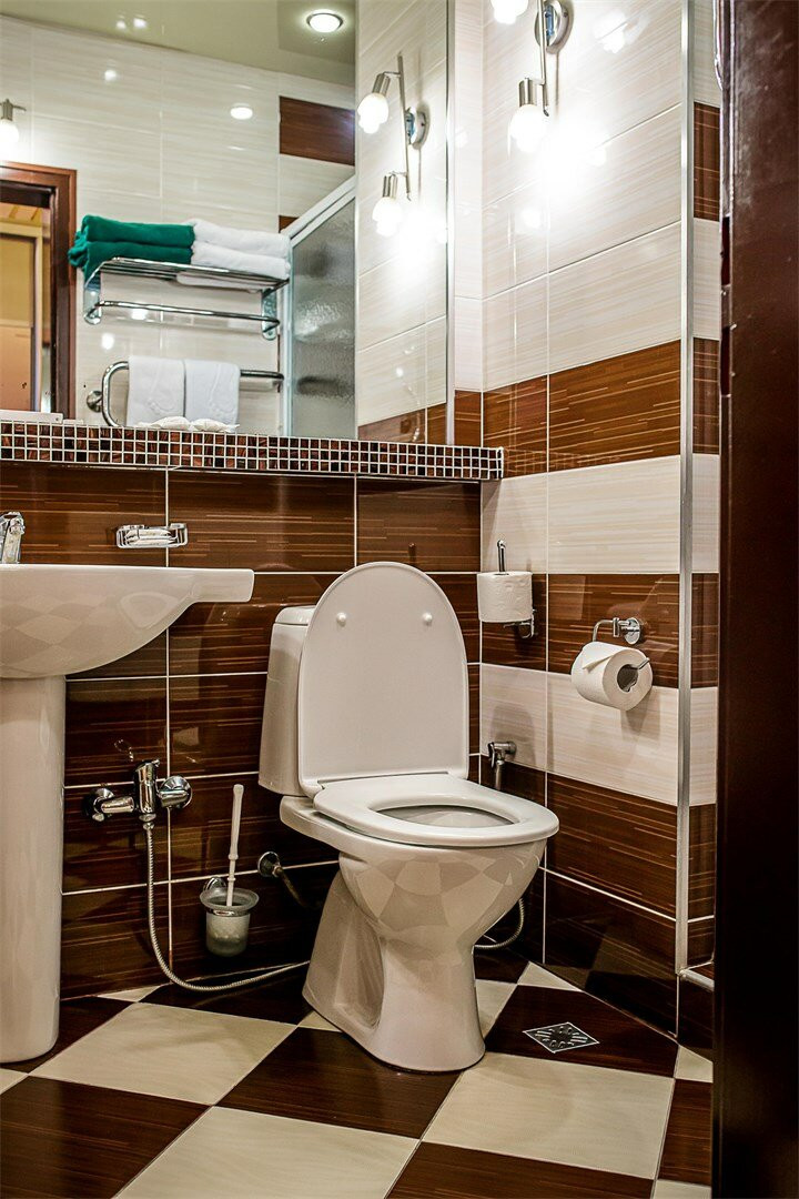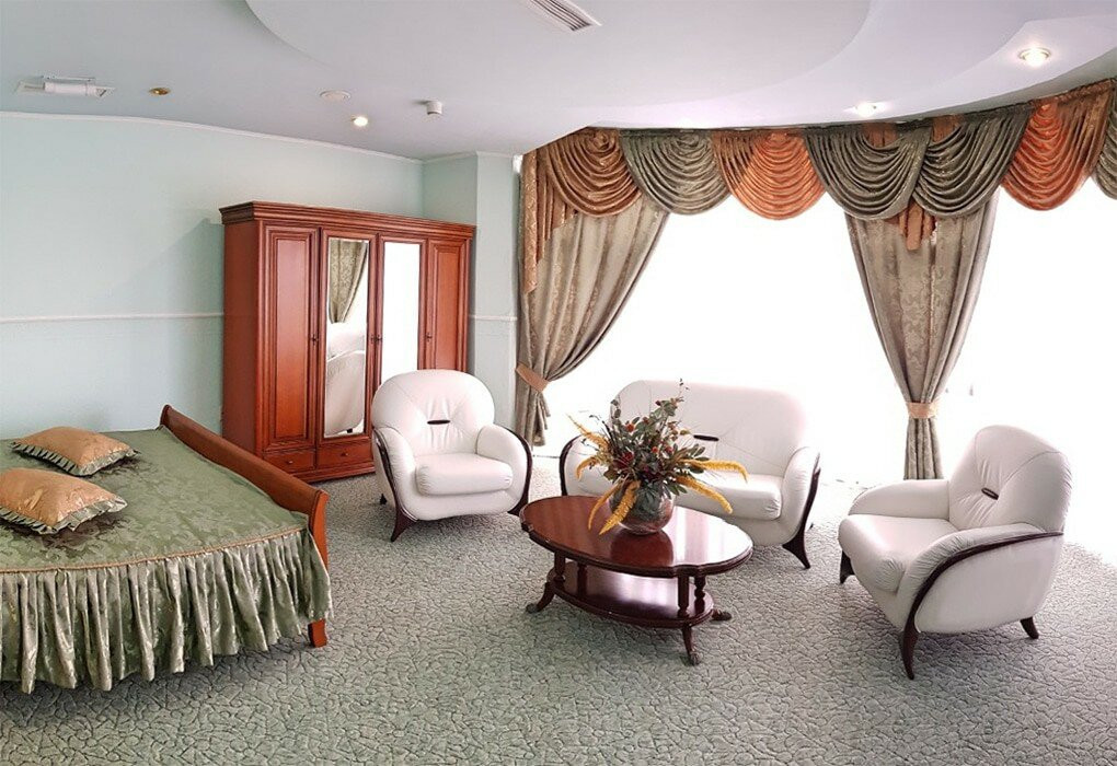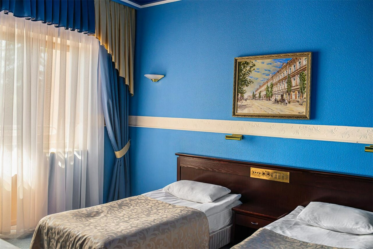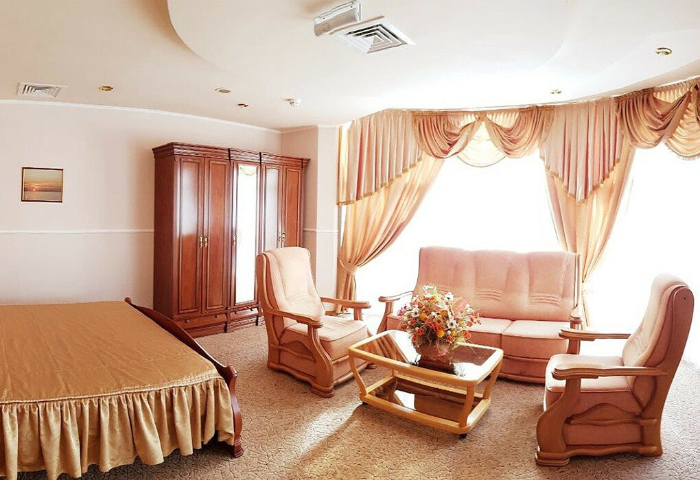 В номерах обшарпаная мебель. Трещины в потолке. Постоянный гул от вытяжки. Текущая сантехника. Смотрели три номера на 6 этаже: везде так.
