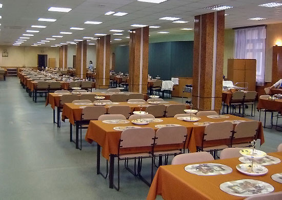Здравница предлагает полный пансион. Трехразовое питание по заказному меню включает блюда общего и диетического рациона.