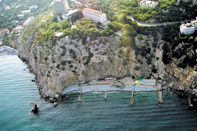 Санаторий имеет собственный мелкогалечный пляж оборудованный: теневыми навесами, лежаками, кабинками для переодевания, питьевыми фонтанчиками, душевыми. На пляже работают бары, пункты проката водного снаряжения. Сообщение с пляжем-два скоростных лифта, длина тоннеля 90 метров.