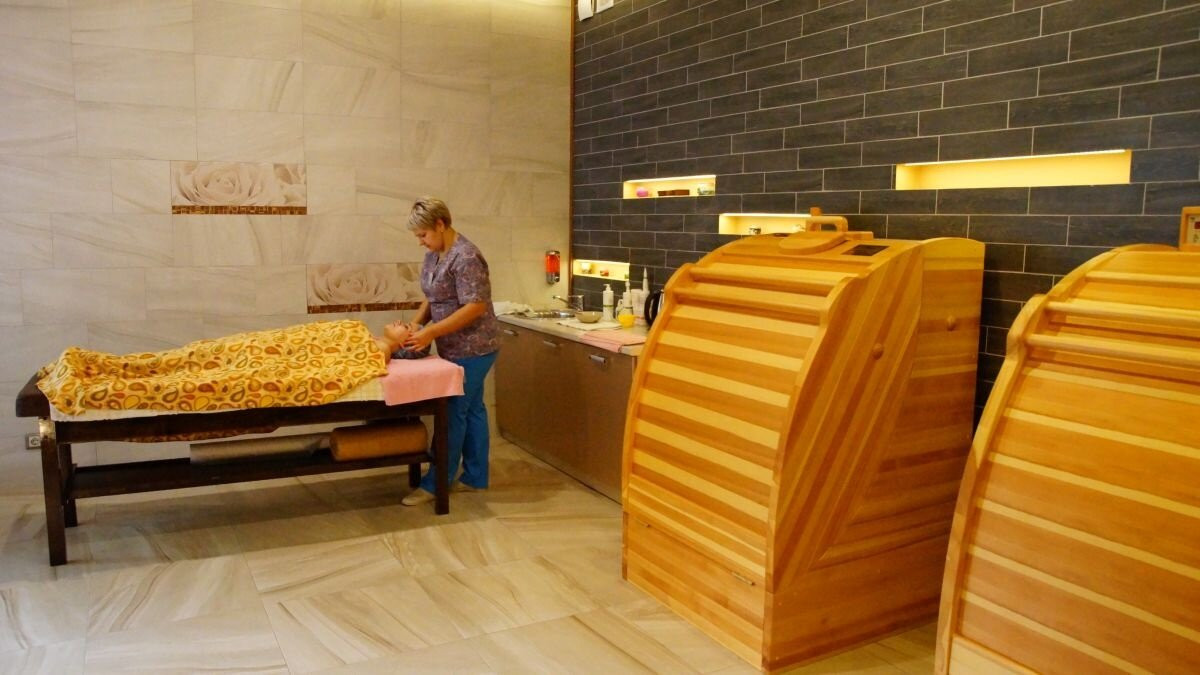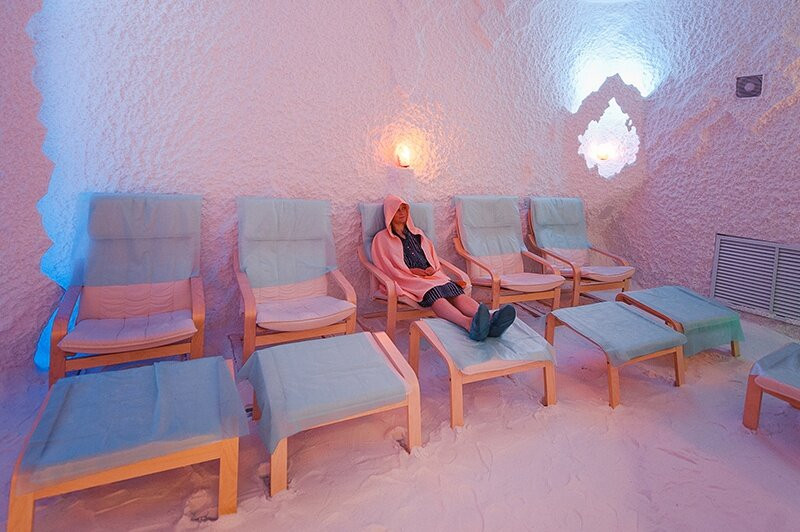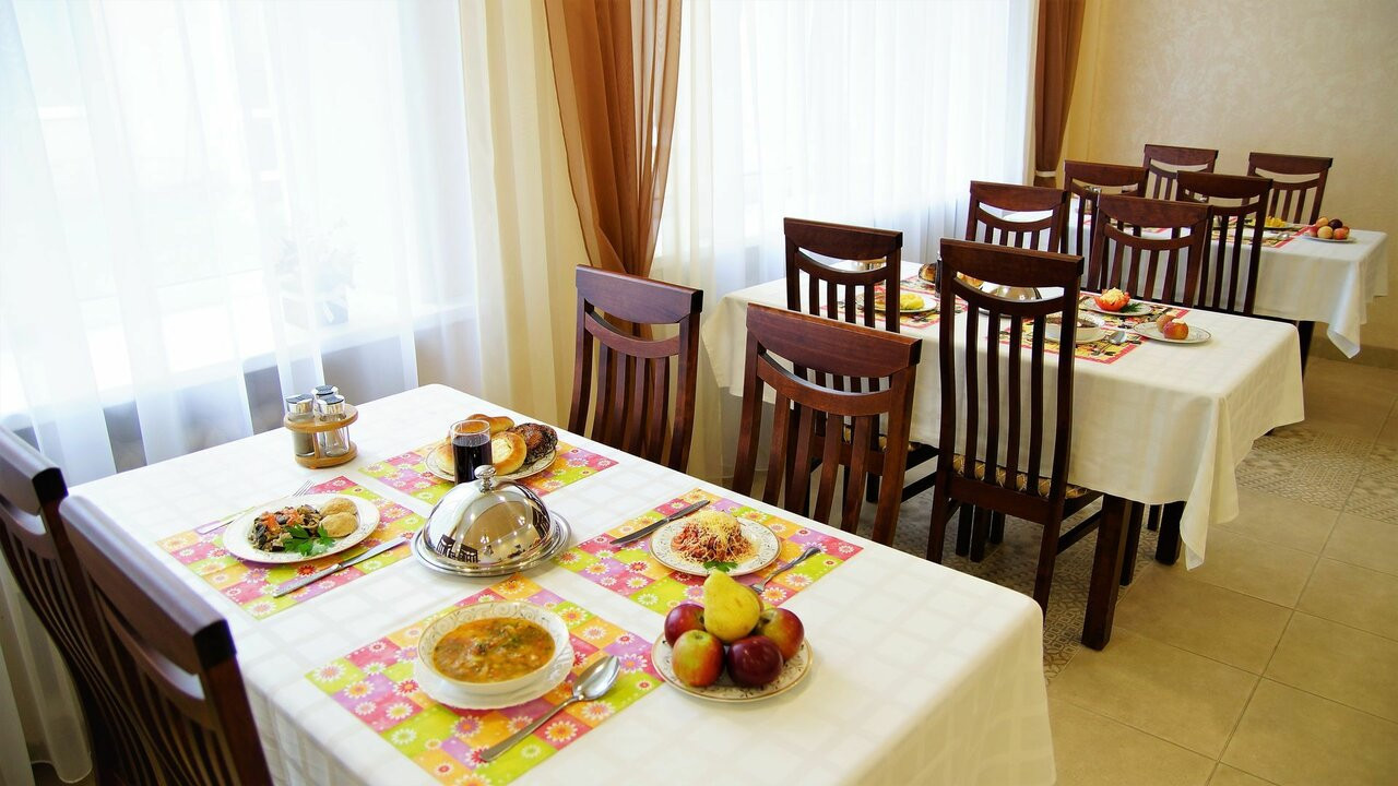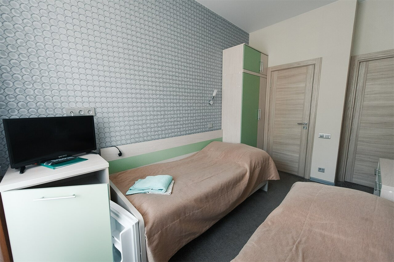 Шестиэтажное здание санатория соединено теплыми переходами со столовой и лечебным корпусом в единый комплекс, что делает его очень удобным для отдыхающих при любой погоде. Прилегающая лесная территория оборудована удобной для прогулок «Тропой здоровья».